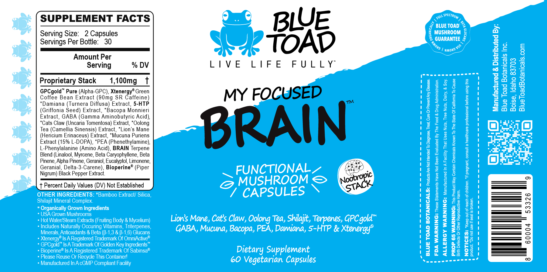 Blue Toad™ BRAIN Capsules are the perfect blend of functional mushrooms, Ayurvedic botanicals & adaptogens supporting brain health, focus & memory. Our proprietary MY FOCUSED BRAIN™ Microdose formula is unique, highly effective & backed with patented ingredients like Xtenergy®, a nootropic that has clinically demonstrated benefits including: sustained alertness & better mood with less jitters or fatigue, & GPCgold™ Alpha-GPC a potent brain-health nutrient! Adding Organic Lion's Mane, Organic Damiana, Organic Bacopa Monnieri, GABA, Organic Oolong Tea, Organic Cat's Claw, Organic Mucuna Pruriens, PEA, 5-HTP, BioPerine®, Shilajit and our proprietary Terpene Stack makes My Focused BRAIN™ the best choice for brain health and memory!